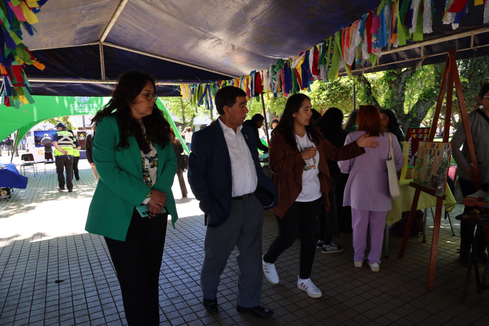 El alcalde Jorge Radonich Barra, junto a la administradora municipal Marcia Órdenes, la jefa de la Unidad de Desarrollo Económico Local (UDEL), Mónica Chávez, y la jefa de sede del CFT Lota Arauco en Cañete, Valeria Bernal Mendoza, realizaron un recorrido por los distintos stands, destacando la creatividad, el compromiso y la proyección de los jóvenes participantes.